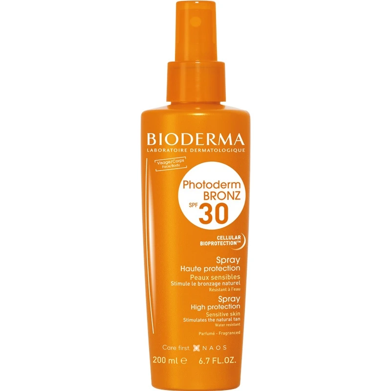 Bioderma Photoderm Bronz Spray SPF 30 går samtidig ind og biologisk stimulerer den naturlige bruningsproces i huden, og hjælper ligeledes med til at forlænge holdbarheden af den solbrune kulør. Derudover indeholder den også et Cellular Bioprotection patent, som styrker hudens naturlige forsvarssystemer, for at gøre huden mere modstandsdygtig overfor negative effekter fra solens stråler.