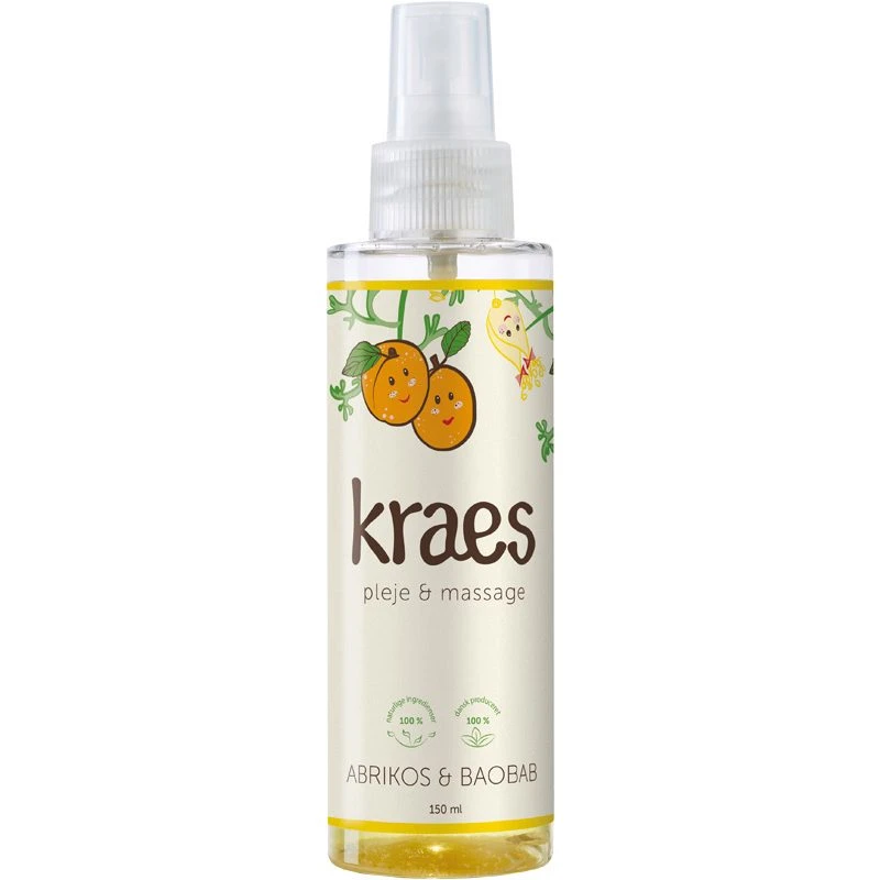 KRAES Pleje & Massage Olie er en lækker olie til babyer og børn, som er ideel til både hudpleje og massage. Den består udelukkende af nøje udvalgte og 100 % naturlige olier fra bl.a. abrikos og baobab, som virker fugtgivende, blødgørende og anti-inflammatoriske og gør huden dejlig blød og elastisk. Den er nem at smøre ud og efterlader ikke huden med en fedtet fornemmelse, ligesom den heller ikke tilstopper porerne.