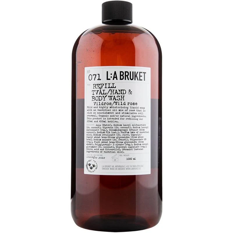 L:A Bruket 071 Hand & Body Wash Refill – Wild Rose er en refill til L:A Bruket 071 Hand & Body Wash, som er en lækker, flydende sæbe, der kan anvendes til både hænder og krop. Den har en mild og yderst fugtgivende formel, baseret på naturlige og økologiske ingredienser, som skånsomt renser huden og efterlader den dejlig blød og ren.