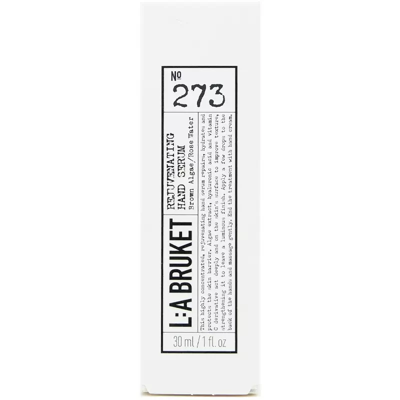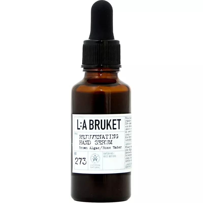 L:A Bruket 273 Rejuvenating Hand Serum er beriget med reparerende brunalger, som forbedrer hudens tekstur, mens hyaluronsyre tilfører og binder fugt i huden. Endelig bidrager C-vitaminderivatet, ascorbyl glucoside, med lysnende og beskyttende egenskaber, som er med til at reducere og forbygge pigmentpletter i huden. Endelig vil rosenvand forkæle både hud og sanser med en skøn duft, ligesom det også bidrager med beroligende egenskaber.