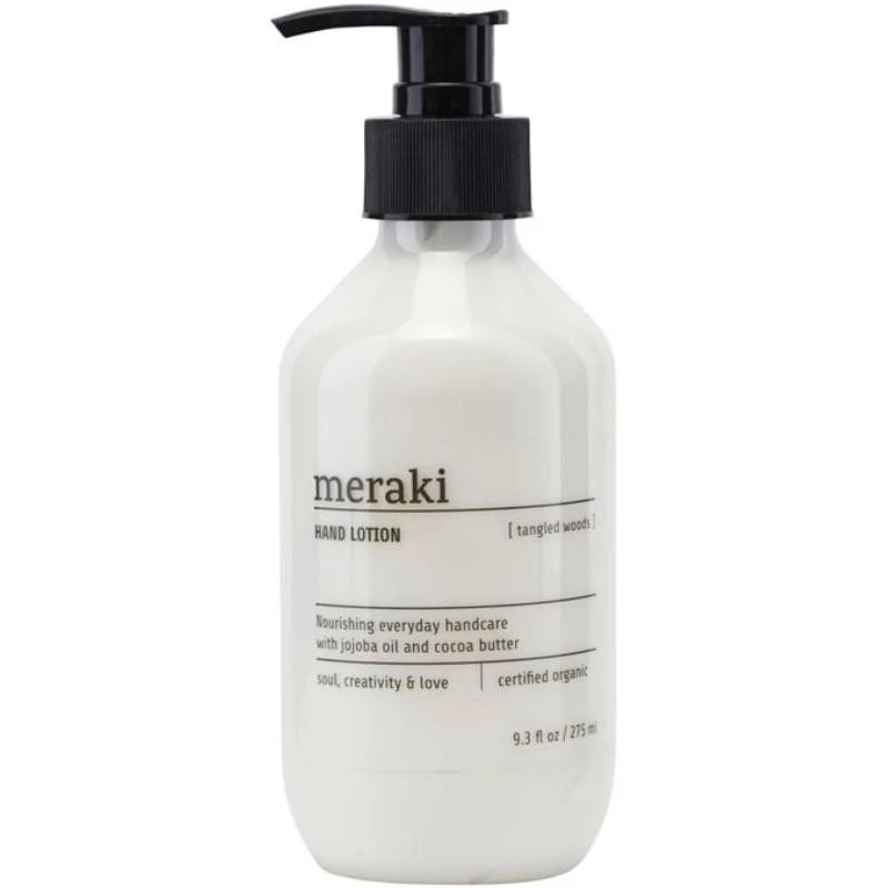 Meraki Hand Lotion Tangled Woods er en rigtig lækker håndcreme. Denne håndlotion med en duft af tangled woods fra Meraki, er perfekt til dig der gerne vil have bløde hænder og som elsker en rig duft af vores elskede natur. Vores økologisk certificeret håndlotion, indeholder økologisk aloe vera og kakaosmør, der plejer, fugter og blødgør hænderne – uden at fedte. Stil din håndlotion på badeværelset eller i køkkenet, og brug den efter håndvask, eller når dine hænder trænger til ekstra pleje. Den er velegnet til daglig brug og til alle hudtyper.