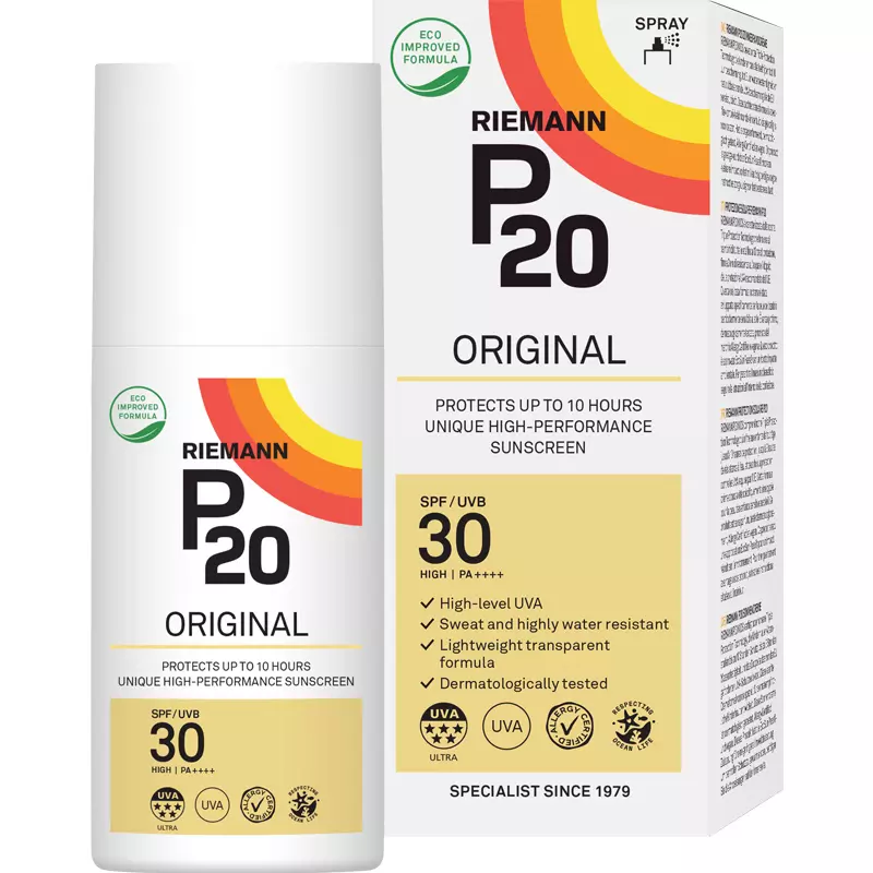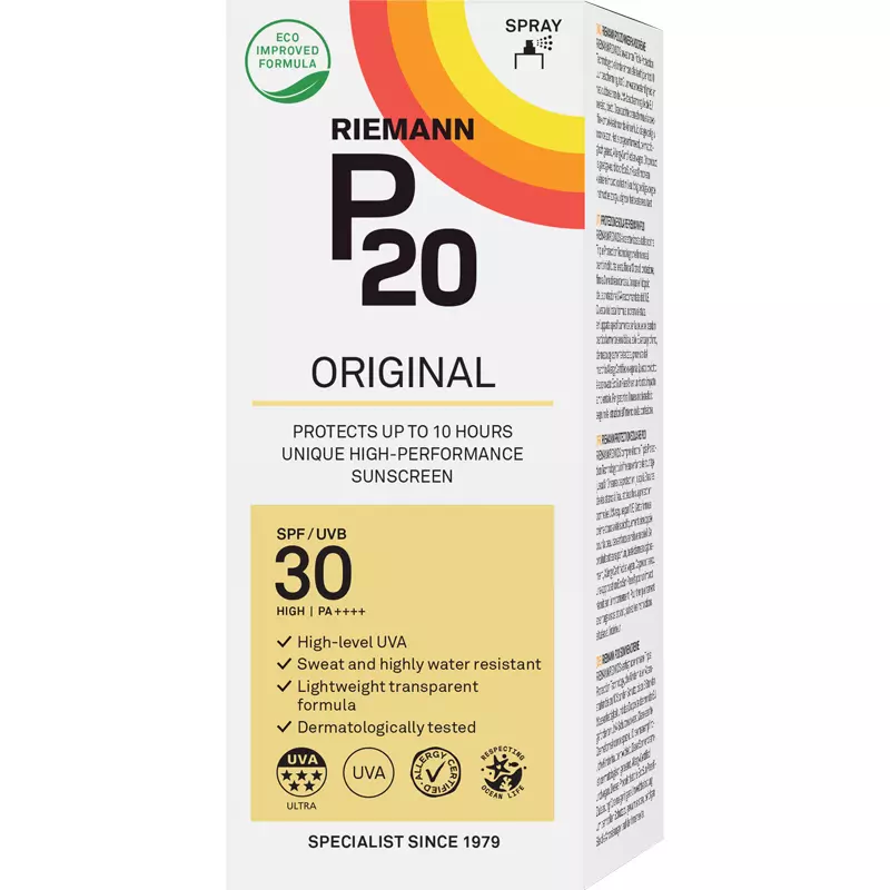 P20 Riemann Original Sun Protection Spray SPF 30 er en helt fantastisk og effektiv solspray med solfaktor 30. Den giver høj beskyttelse mod solens UVA- og UVB-stråler, og har højere UVA-beskyttelse end EU-anbefalingen foreskriver, som hjælper med at forebygge solrelaterede skader i huden.