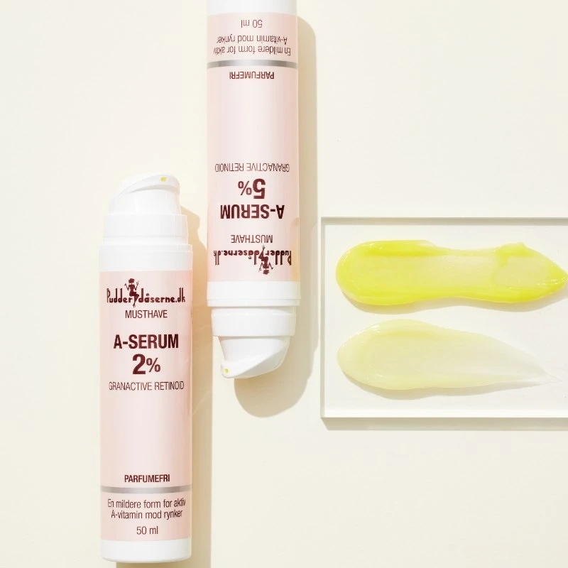 Pudderdåserne A-Serum findes også i en udgave med 2%, og det anbefales altid at starte med 2%, med mindre man har været vant til at bruge produkter med A-vitamin i højere doser. Hvis man ønsker mere effekt kan man skifte til 5% efter første flaske med 2% er brugt.