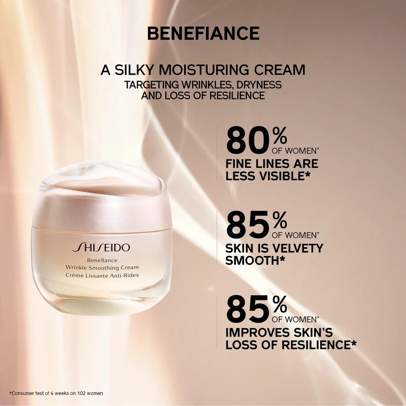 Shiseido Benefiance Wrinkle Smoothing Cream er en skøn dag -og natcreme til alle hudtyper. Den indeholder den unikke ReNeura TechnologyTM+, som går ind og vækker de sensoriske receptorer i huden. Derudover bliver hudens sanser stimuleret, og derved mere modtagelig overfor cremens aldersreducerende fordele. Med denne fantastiske creme opnår man en en smukkere hud, hvor overfalden efterlades mere strålende og smidig, samtidig med at rynker udglattes og den ungdommelige fylde genopbygges.